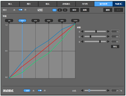 PX2000UL+還可以對多機(jī)中的某一臺(tái)設(shè)備,或一臺(tái)設(shè)備中的某一塊區(qū)域進(jìn)行色彩精確校準(zhǔn),在影響一致性效果的原因不是偏色而是灰階時(shí),PX2000UL+同樣可以調(diào)整不同層次的Gamma曲線,對RGB分色調(diào)校,從而保證畫面色彩的一致性。