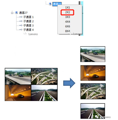 同時MVP處理器具有圖像分割功能,一個訊號源中的組合畫面,如監(jiān)控系統(tǒng)里的4畫面、9畫面、16畫面等,都可以通過MVP的圖像分割功能,拆分成多個單一信道顯示,無需增加額外的分割設(shè)備;例如:一路訊號源中顯示4分屏,通過MVP軟件可以將其分割4路獨立的輸入信號信道,被分割出來的任意一路信號,都支持任意迭加、漫游、窗口縮放。