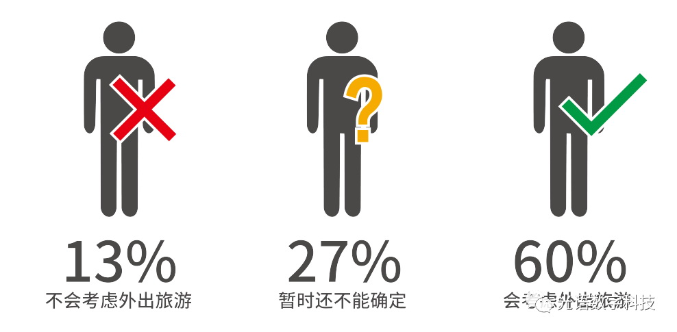 劇《疫情過后游客出游意愿調(diào)研報告》顯示,受訪游客中有高達(dá)60%的人明顯表達(dá)了出游的意愿,27%的游客因暫時還不能確定而持觀望態(tài)度;只有13%的游客出于對健康安全的擔(dān)心表示今年不考慮出游。總體而言,游客的出游意愿還是很明顯的。非典時期,一項“非典之后最想做什么”的調(diào)查數(shù)據(jù)顯示,排在第一位的是占比32.2%的外出旅游,第二位才是占比30.8%的探望親人。