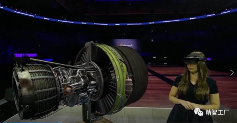 AR技術(shù)在裝備維護另一個典型應(yīng)用是沉浸式交互。下圖展示利用Hololens進行發(fā)動機的交互式培訓(xùn)。多個共享一個虛擬現(xiàn)實的場景,由一位有經(jīng)驗的“師傅”進行講解與培訓(xùn)。