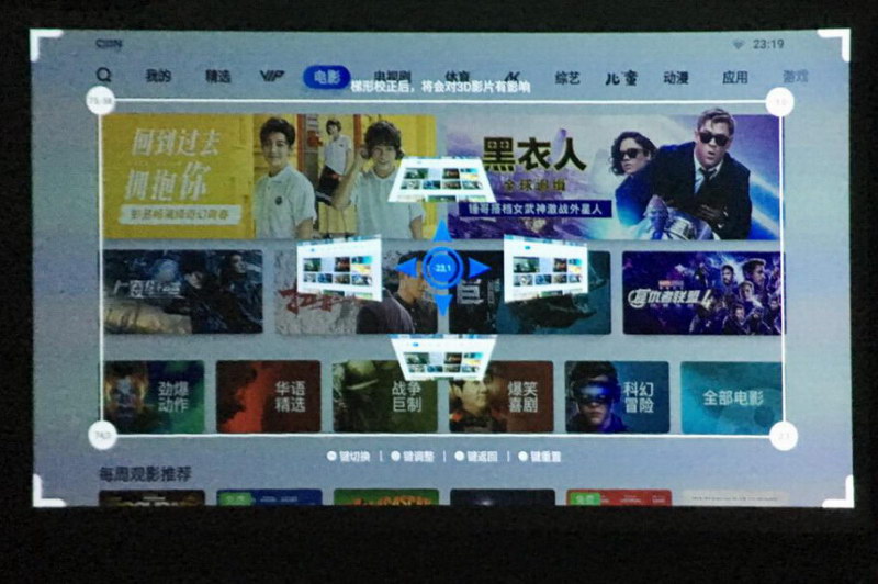 我一般會把堅果G7S放在臥室的床頭柜上,雖然是在側(cè)方位置,但呈現(xiàn)的畫面效果還是正的。這歸功于堅果G7S自帶的一鍵對焦和梯形校正功能,它可以在45度范圍內(nèi)對畫面進行調(diào)整和補償,保證投影畫面方正不易變形,設置起來也非常合理方便。
