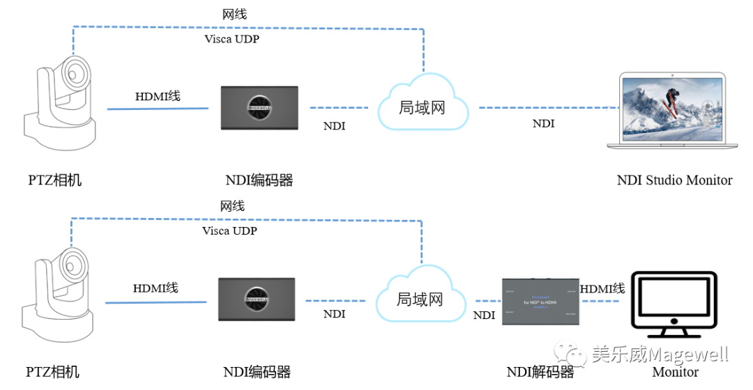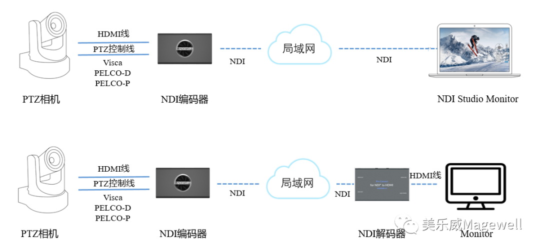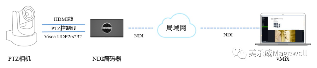 針對(duì)具有RJ45網(wǎng)口的PTZ相機(jī),用戶(hù)可將攝像機(jī)連入美樂(lè)威NDI編碼器相同的局域網(wǎng),并通過(guò)HDMI線(xiàn)連接該編碼器。由NDI解碼端(可以是支持NDI解碼且整合了NDI PTZ SDK的軟件,如NDI studio monitor或者是美樂(lè)威NDI解碼器)發(fā)送過(guò)來(lái)的PTZ指令會(huì)被美樂(lè)威NDI編碼器轉(zhuǎn)換后以Visca UDP協(xié)議發(fā)給PTZ相機(jī),進(jìn)而控制PTZ相機(jī)。具體設(shè)備連接方案如下圖: