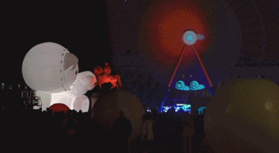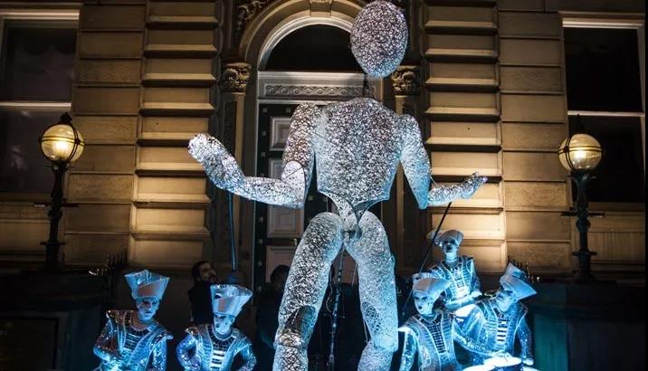 極簡風(fēng)格的巨型發(fā)光人偶和服飾造型光怪陸離的鼓手們
