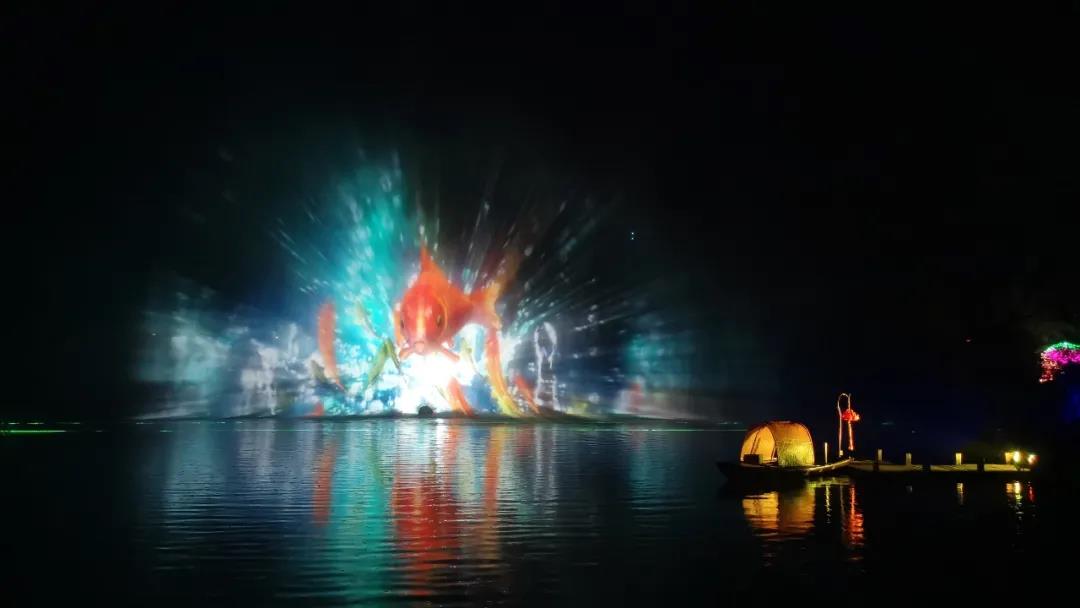 就在觀眾不經(jīng)意時,一條火紅的錦鯉躍然而出,又猛地扎進(jìn)湖面,畫面栩栩如生,十分連貫。