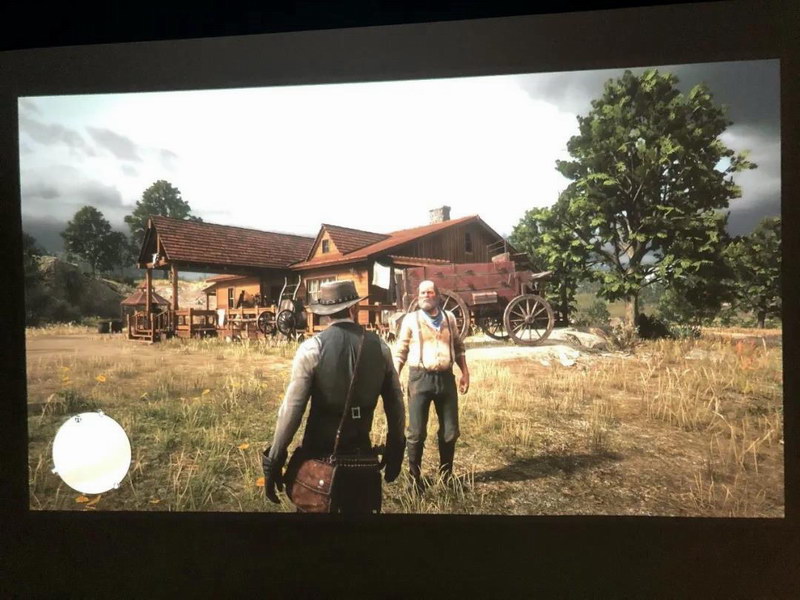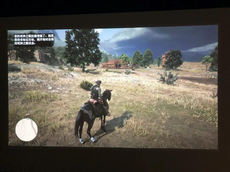 不僅如此,它支持HDR10和HLG,增強(qiáng)對(duì)比度,充分展現(xiàn)暗部和亮部細(xì)節(jié)。打開(kāi)4K投影機(jī)的HDR模式后,《荒野大鏢客2》逆光場(chǎng)景非常通透,主人公亞瑟騎馬奔走于草原上,陽(yáng)光從山崖間穿過(guò),光暈過(guò)渡自然,逆光的草葉也很清晰,畫(huà)面壯美。