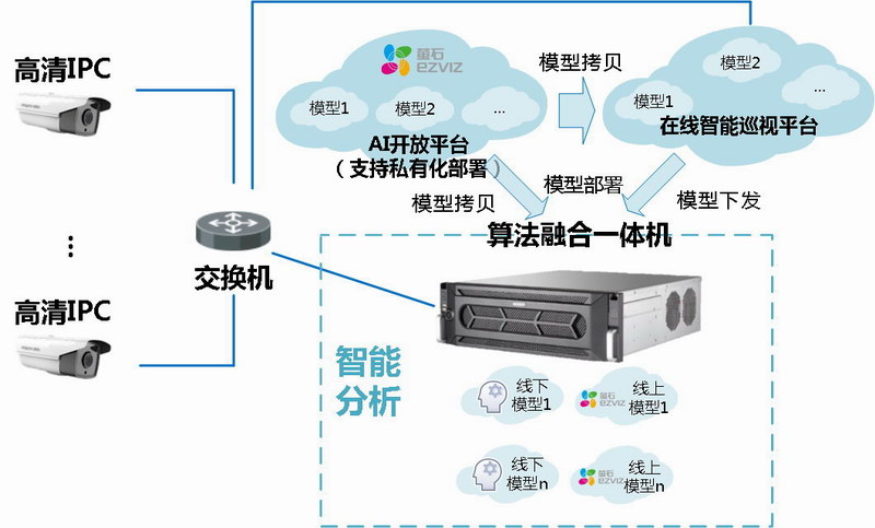 算法融合一體機(jī)是本系統(tǒng)的核心組成設(shè)備。除了出廠預(yù)裝的成熟算法,還支持通過(guò)螢石AI開(kāi)放平臺(tái)訓(xùn)練。對(duì)于不成熟的算法,前期需要采集素材,經(jīng)訓(xùn)練后初步上線,在使用過(guò)程中通過(guò)不斷采集素材進(jìn)行訓(xùn)練,完成算法的迭代。