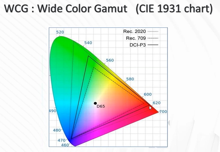 第三個概念是色域,色域標(biāo)準(zhǔn)達(dá)到DCI-P3色域范圍,從上圖我們能比較出更廣的色域帶給我們的視覺體驗(yàn),左邊是DCI-P3色域范圍, 右邊是REC709色域范圍。