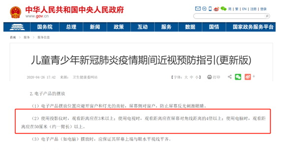 國家衛(wèi)生健康委發(fā)布的《指引》顯示“使用投影儀時,觀看距離應(yīng)在3米以上;使用電視時,觀看距離應(yīng)在屏幕對角線距離的4倍以上;使用電腦時,觀看距離應(yīng)在50厘米(約一臂長)以上。”