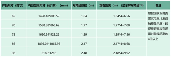 根據(jù)衛(wèi)健委《指引》指示,使用電視時,觀看距離應(yīng)在屏幕對角線距離的4倍以上。由數(shù)據(jù)計算,65英寸電視的要求觀看距離應(yīng)為6.56米;70英寸電視要求觀看距離應(yīng)為7.08米;75英寸電視的要求觀看距離應(yīng)為7.56米;86英寸電視的要求觀看距離應(yīng)為8.68米;98英寸電視的要求觀看距離應(yīng)為9.92米。