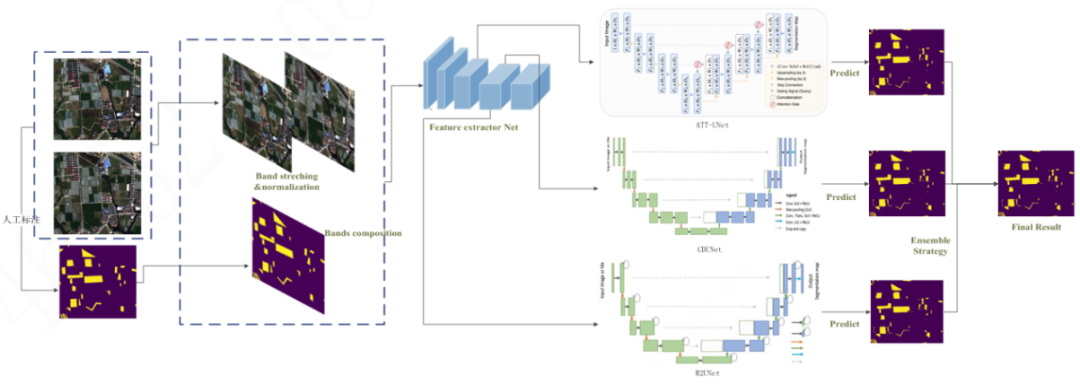 針對遙感影像大尺寸、變化區(qū)域類別不均衡等現(xiàn)象,大華股份在數(shù)據(jù)處理上,提出了一種基于多通道融合的圖像拉伸和歸一化預處理方法,解決了地表差異明顯等問題;模型結構方面,創(chuàng)新使用TverskyLoss損失函數(shù),優(yōu)化了類別不均衡問題;同時,創(chuàng)新構建多模態(tài),大幅度提升算法精度(Precision)與召回率(Recall),最終大華遙感影像智能分析技術刷新了遙感影像變化檢測數(shù)據(jù)集評測記錄,取得排行榜第一的成績。