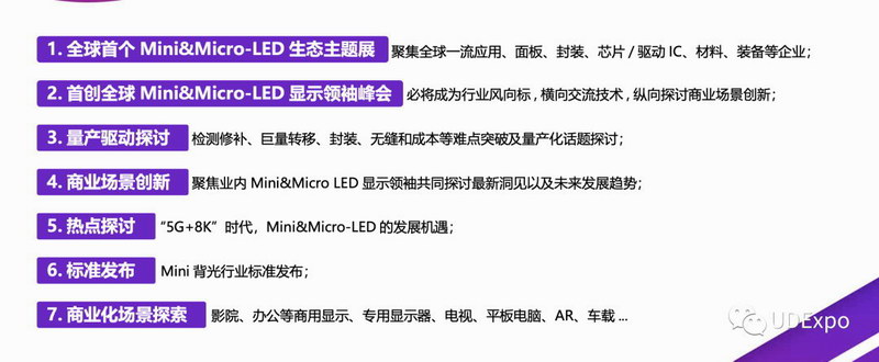 2020 年初,一場(chǎng)突如其來的新型冠狀病毒肺炎迅速席卷全球,給消費(fèi)電子產(chǎn)業(yè)的供應(yīng)鏈、加工生產(chǎn)和市場(chǎng)銷售等各個(gè)環(huán)節(jié)帶來沖擊。疫情面前,信心是金。發(fā)改委等 23 部門聯(lián)合印發(fā)了《關(guān)于促進(jìn)消費(fèi)擴(kuò)容提質(zhì),加快形成強(qiáng)大國內(nèi)市場(chǎng)的實(shí)施意見》,鼓勵(lì)各行業(yè)舉辦自主 品牌消費(fèi)品體驗(yàn)活動(dòng)等,塑造中國品牌形象,提高自主品牌知名度和影響力,擴(kuò)大自主品牌消費(fèi)。為了響應(yīng)這一號(hào)召,UDE 堅(jiān)持辦好 2020 年的會(huì)展活動(dòng),迎接 Mini&Micro-LED 升級(jí)等市場(chǎng)機(jī)遇,特別設(shè)置 Mini&Micro-LED 生態(tài)展區(qū),覆蓋應(yīng)用、面板、封裝、芯片 / 驅(qū)動(dòng) IC、材料、 裝備等,邀請(qǐng)國內(nèi)外知名科技企業(yè)攜旗下最新研發(fā)產(chǎn)品在展臺(tái)上集中亮相,打造 2020 年最全、最新、最集中的 Mini&Micro-LED 產(chǎn)品展示平臺(tái)。為行業(yè)的復(fù)工復(fù)產(chǎn),以及下半年的市場(chǎng)復(fù)蘇搭建好市場(chǎng)推廣平臺(tái)。