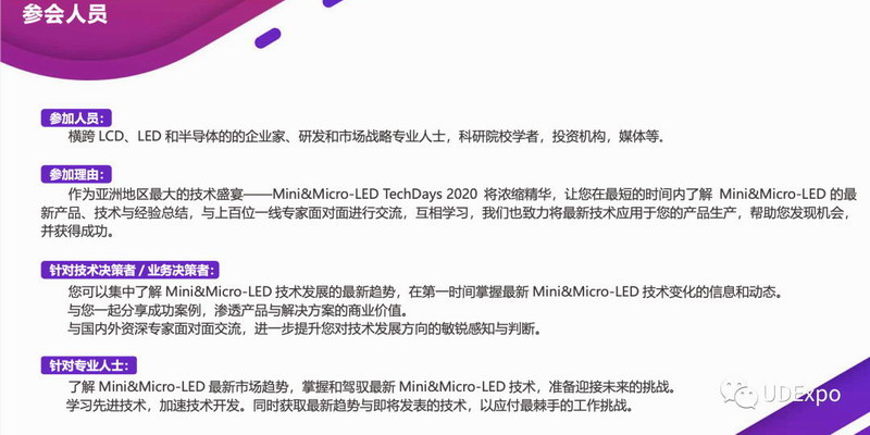 Mini&Micro-LED TechDays 由舜聯(lián)智庫主辦,將于2020年7月31日- 8月2日在第二屆國際顯示博覽會(huì)(UDE2020)同期舉辦。一年一屆,是一個(gè)展示、學(xué)習(xí)和分享的平臺(tái),為來自業(yè)內(nèi)的企業(yè)和個(gè)人提供最新產(chǎn)品和技術(shù)趨勢(shì),直接與業(yè)內(nèi)的本地及國外的技術(shù)專家面對(duì)面交談,分享合作伙伴最新的技術(shù)、解決方案和成功案例,互動(dòng)探討以及更多的學(xué)習(xí)機(jī)會(huì),并且可以幫助企業(yè)家、研發(fā)和市場(chǎng)戰(zhàn)略專業(yè)人士掌握行業(yè)發(fā)展趨勢(shì),尋找伙伴,推動(dòng)其所在企業(yè)和行業(yè)借助科技的力量不斷發(fā)展。