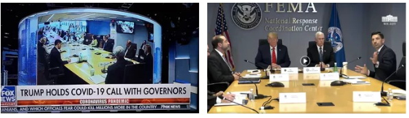 特朗普和副總統(tǒng)彭斯在聯(lián)邦應(yīng)急管理局( FEMA )與各州長舉行視頻電話會議。