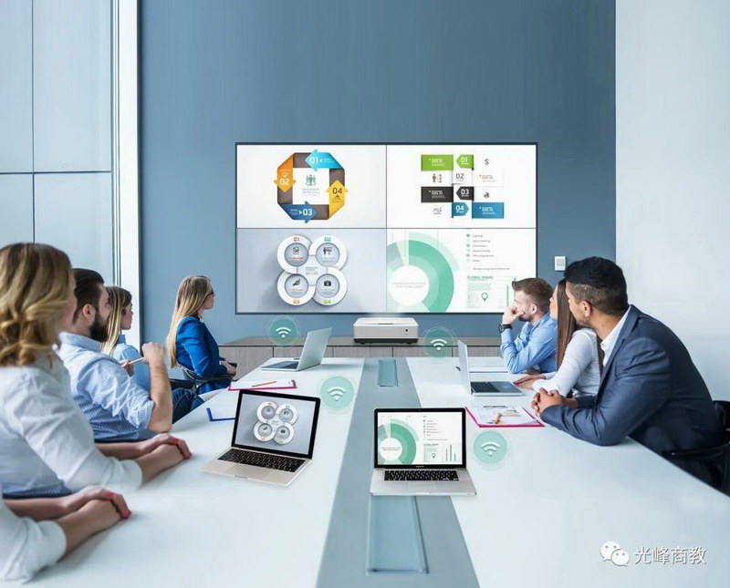 傳統(tǒng)投影機(jī)光源為燈泡,長久使用以后有壽命短,更換耗材成本高,亮度偏低,無高清分辨率,時間長了顏色偏色等諸多槽點。從長遠(yuǎn)來看,選擇一款優(yōu)質(zhì)的投影機(jī),對使用者和公司而言極其重要。光峰高清超短焦投影機(jī)亮度可達(dá)5300流明,整機(jī)分辨率為1920*1080。在明亮的會議室里,告別亮度低和畫面模糊的顯示效果,圖表文字清晰,畫面明亮銳利。光峰高清超短焦投影機(jī)最多能支持4臺設(shè)備同時投屏,實現(xiàn)更加高效智慧的會議。