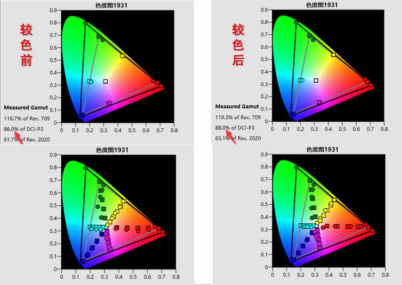 HDR校色前,過渡色偏移較大,P3色域值達到86%。校色后,過渡色改善(綠色最為明顯),P3色域值達到88%。