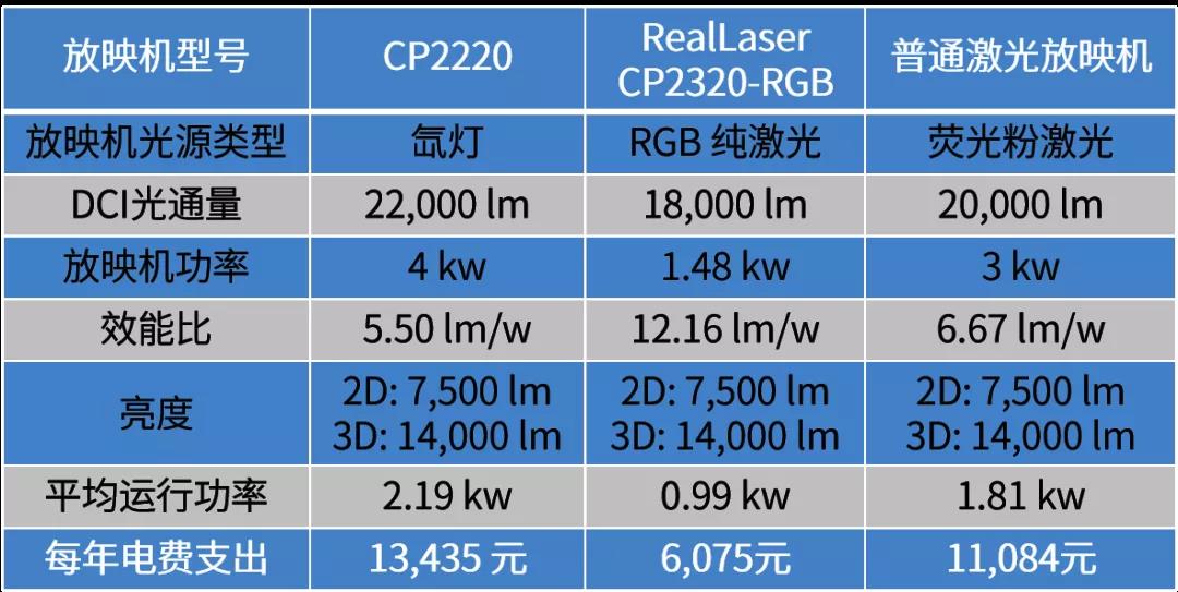 計算參數備注:2.4增益銀幕;3D光效26%;2D目標亮度 14 fL,3D目標亮度 7 fL;每天 3D 影片排片率 70%;每天放映時長12小時;電費 1.4元/小時。