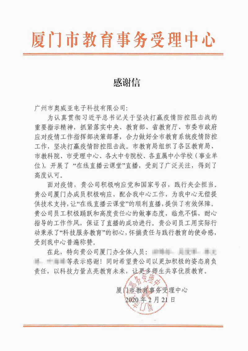 圖為奧威亞獲廈門市教育事務(wù)受理中心感謝信