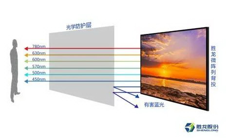 健康護(hù)眼。波長(zhǎng)處于400nm-450nm之間的短波藍(lán)光具有極高能量,能夠穿透晶狀體直達(dá)視網(wǎng)膜,使眼睛內(nèi)的黃斑區(qū)毒素量增高,并導(dǎo)致光敏感細(xì)胞缺少養(yǎng)分從而引起視力損傷,而且這些損傷是不可逆的,會(huì)嚴(yán)重威脅觀看者的眼底健康。微陣列背投產(chǎn)品投影面的光學(xué)膜設(shè)計(jì)是勝龍股份匠心所在,勝龍研發(fā)團(tuán)隊(duì)投入大量研發(fā)經(jīng)費(fèi),歷時(shí)多年成功在光學(xué)設(shè)計(jì)中增加了抗藍(lán)光因子和漫反射層,最大程度改變了有害藍(lán)光和眩光的視力損害,有效保護(hù)觀看者視力。