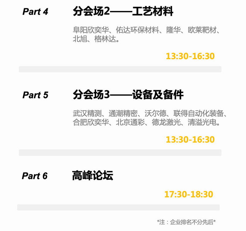 默克、AKT、康寧、旭硝子、和成、誠志永華、凱世通、衛(wèi)利國際、惠亞、沃爾德、中芯國際、德龍激光、君華、康得新、凱盛、惠晶、集創(chuàng)北方、蚌埠高華、京圳永達(dá)、威格氣體、東億啟德、信德威激光、大族激光、江蘇鳴初、國茂電子、西安彩晶、八億時(shí)空、杭州安諾過濾、杭州遠(yuǎn)方光電、丸紅、佳能光學(xué)、東電電子、東旭、彩虹、美埃凈化、杭州安諾濾材、金龍機(jī)電(杭州)、上海微電子裝備、上海儀電、廣西晶聯(lián)、洛陽四豐、海寧英德賽、法國液化空氣、光傲科技、明基材料、亞智科技、深圳易天自動(dòng)化、宇瑞化學(xué)、上海通彩自動(dòng)化、南京日立科技、南京冠佳科技、奇美材料、常州蘇晶電子、常州華威新材料、深圳勁拓自動(dòng)化、昆山佳騰光電塑膠、福建邵武永晶化工、福建阿石創(chuàng)、中船重工725所、盟立自動(dòng)化、夏普電子研發(fā)(成都)、江陰江化微電子、歐姆龍自動(dòng)化、萬機(jī)儀器、太湖金張科技、綠菱氣體、廈門科華恒盛、攀時(shí)(上海)高性能材料、凌云光技術(shù)、寧波蘇博科能、落利刻新材料、安徽大富光電、成都工投電子新材料、LG化學(xué)、寶億自動(dòng)化、首科文創(chuàng)、西安瑞聯(lián)新材料、武漢領(lǐng)顯電子、捷凱科技、江蘇新科、中科電風(fēng)華信息裝備、北京兆維科技、昱射光電科技、南京寶昆電子、南京冠石科技、南京貝迪電子、南京華拓智能、壹度科技、睿之宇、山西大眾機(jī)械廠、蚌埠高華電子、成都路維光電、美客鋁制品、莎益博工程系統(tǒng)開發(fā)、北京鼎材科技、基邁克、騰盛、晶美晟光電、奧徒激光、四川阿格瑞、晶銫電子、華大九天軟件、廣州美凱信息技術(shù)、東曹石英株式會社、格美鎢鉬、四川梅塞爾氣體產(chǎn)品、Tokyo Electron、Pall Corporation、歐萊濺射靶材、華麗工程、博源恒芯、石梅新材料、天祥質(zhì)量技術(shù)、盟拓智能、天津福萊迪科技、杭州格林達(dá)、福建晟哲自動(dòng)化、太原航空儀表、寧波長陽科技、落利刻新材料、萊寶高科、海的電子科技、寧波激智、深圳清溢光電、杭州科斯瑪膜材料、深圳市道爾頓、武漢尚賽光電、三維電子塑膠、西安彩晶、強(qiáng)力昱鐳光電、盛弘電氣、賽爾科技、友機(jī)光顯、卓群納米新材料、冠靶科技、江豐電子、上方電子裝備、國星光電、大族激光、盧米藍(lán)新材料、捷時(shí)雅、奇鼎科技、中國電子進(jìn)出口有限公司、陜西煤業(yè)化工技術(shù)研究院、四川省中明環(huán)境治理、天準(zhǔn)科技股份、亞顯(上海)光電、容大感光……