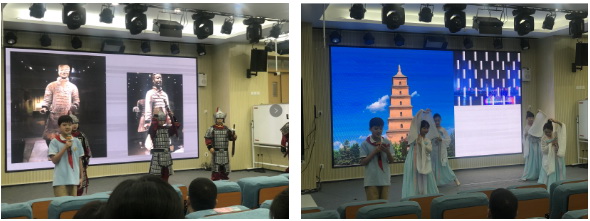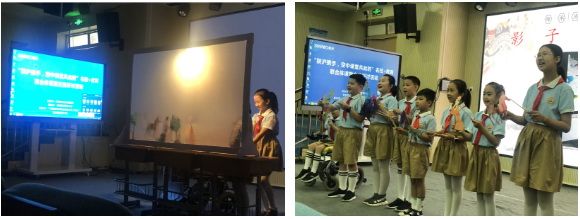 灃東四小老師帶領(lǐng)學(xué)生現(xiàn)場(chǎng)展示西安皮影贈(zèng)送客人、幾組學(xué)生對(duì)做好的皮影介紹、合影,祝福語(yǔ)祝福上海的師生朋友,后送給西安現(xiàn)場(chǎng)嘉賓。