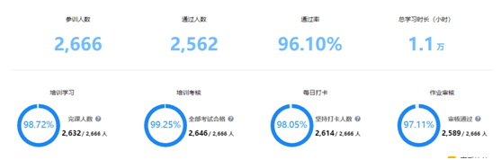 此次培訓(xùn)獲得河池宜州區(qū)教育局高度重視以及全區(qū)老師的積極響應(yīng),截至2020年6月1日,初階培訓(xùn)取得圓滿的成功,全區(qū)教師累計(jì)學(xué)習(xí)時(shí)長(zhǎng)共計(jì)1.1萬小時(shí),培訓(xùn)考核通過人數(shù)為2562人,考核成功率超96%,此次培訓(xùn)達(dá)到預(yù)定目標(biāo),基本實(shí)現(xiàn)老師能夠通過培訓(xùn)掌握交互式課件制作的要求。
