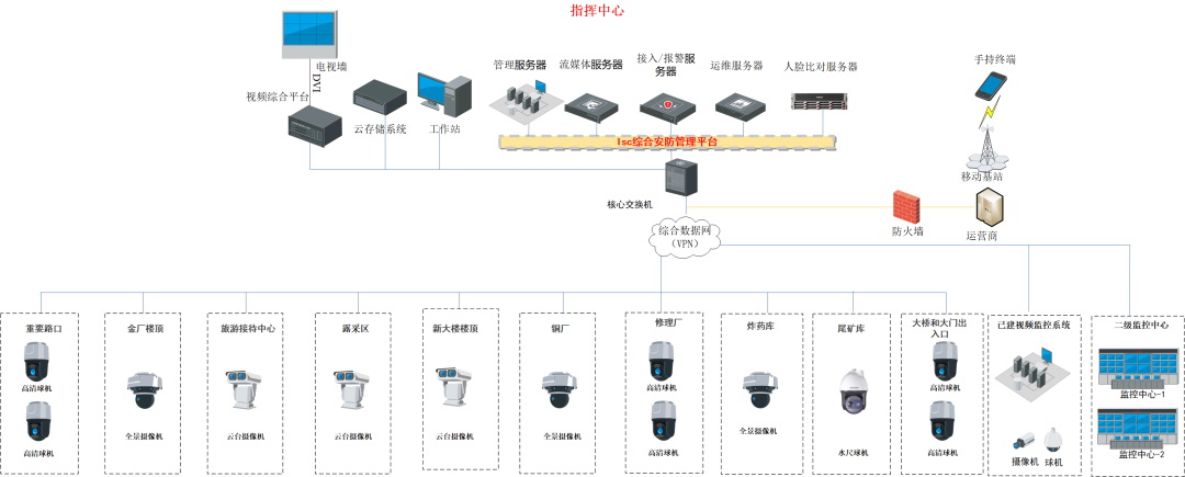 以某大型礦山為例,?低暋疤煅邸毕到y(tǒng)的建設(shè)內(nèi)容主要包括:露采區(qū)域、卡調(diào)大樓、銅廠、旅游接待中心、金廠、炸藥庫、大橋和大門出入口、尾礦庫、以及各重要路口等重點(diǎn)關(guān)注區(qū)域的可視化系統(tǒng)建設(shè)。