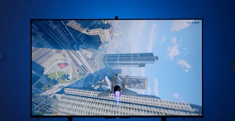 另外,主機(jī)游戲玩家也可以在這款電視上得到很好的暢玩體驗(yàn)。尤其是在GTA 5里面人物快速轉(zhuǎn)身,通過慢動作可以看出槍體,沒有出現(xiàn)畫面撕裂和拖影的情況出現(xiàn),而在汽車快速飆車飛機(jī)快速劃過建筑物的時候,游戲體驗(yàn)十分順滑,從未感知到卡頓,這些效果的背后是4K 120HZ VRR高動態(tài)變頻屏幕,從而讓畫面表現(xiàn)更加暢快,同時也帶來了更順滑的音畫同步效果。