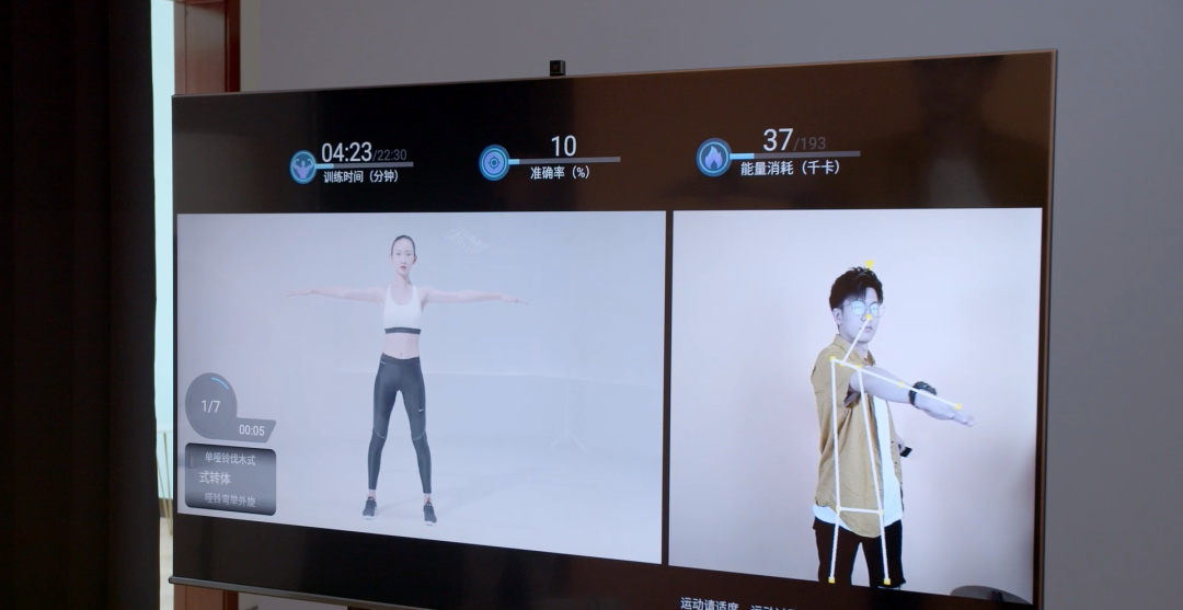 在工作完成之后就可以直接開始自己喜歡的事。憑借這塊升降鏡頭模組,實(shí)現(xiàn)了許多電視不具備的功能,比如手勢控制、舉手暫停,一個手指靜音,尤其在健身方面,可以實(shí)時檢測你的運(yùn)動軌跡和教學(xué)視頻進(jìn)行對比,給出建議,這樣就能事半功倍。