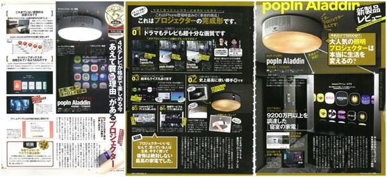 日經(jīng)時尚(Nikkei Trendy,類似于國內(nèi)《第一財經(jīng)周刊》)評價它是“2019年最火的產(chǎn)品!” 日本家電雜志評論:“你需要買的是popIn Aladdin,而不是4K電視!保ǎ碖テレビが格安で楽しめる今、「あえて買う理由」があるプロジェクター)。日本著名生活雜志MONOQLO(類似于國內(nèi)《新周刊》)也大贊阿拉丁神燈為“與iPhone問世媲美的革命性產(chǎn)品”(iPhone登場時並みの「革命的商品」)”。