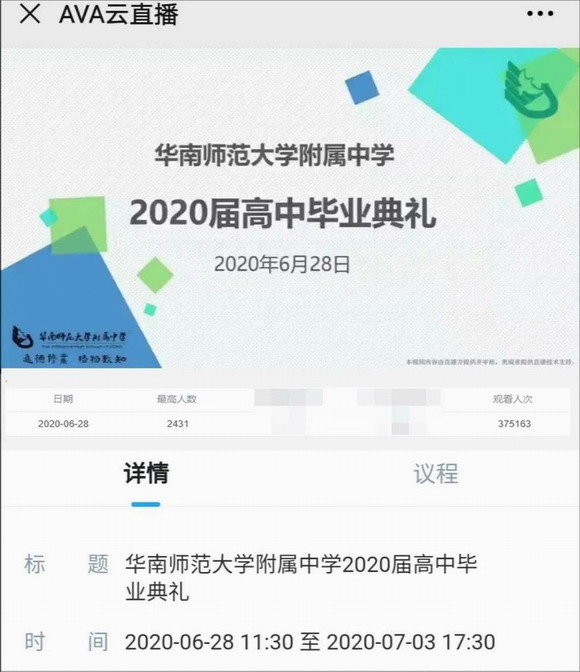 對(duì)于無(wú)法親臨典禮現(xiàn)場(chǎng)的家長(zhǎng)們,華南師大附中提供了直播和點(diǎn)播回看兩種方式供其選擇。此次直播畢業(yè)典禮,在線觀看超37萬(wàn)人次。