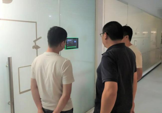 來訪學員在DANACOID工程師陪同下參觀智慧會議室并演示人臉識別、無紙化系統(tǒng)等功能。
