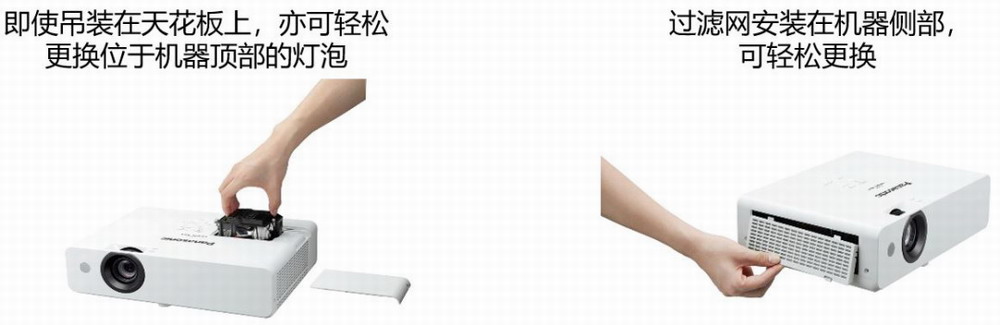 松下商教投影機(jī)UX系列機(jī)身結(jié)構(gòu)設(shè)計(jì)非常人性化,即便需要更換燈泡和過濾網(wǎng)時(shí)也可以輕松更換,節(jié)省時(shí)間。