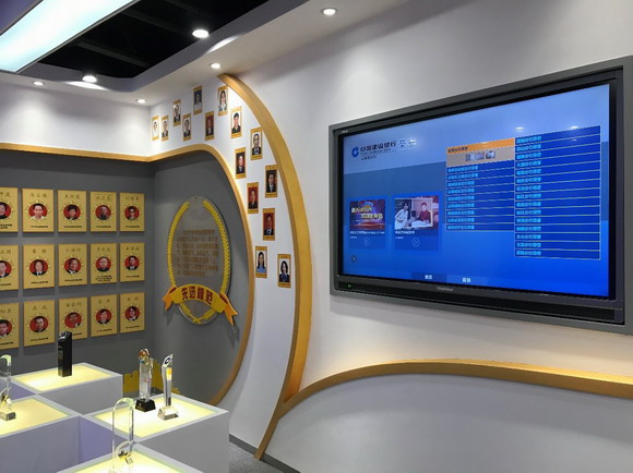 企業(yè)簡介展示區(qū)是一臺65英寸newline智能交互平板,既是企業(yè)實時動態(tài)的展示平臺,又能化身為展廳的信息檢索中心。只需輕輕一點,銀行的各個部門系統(tǒng)或業(yè)務構(gòu)成、相關(guān)的文字與視頻內(nèi)容即可映入眼簾,讓嘉賓們輕松獲悉中國建設銀行的業(yè)務優(yōu)勢與特色。
