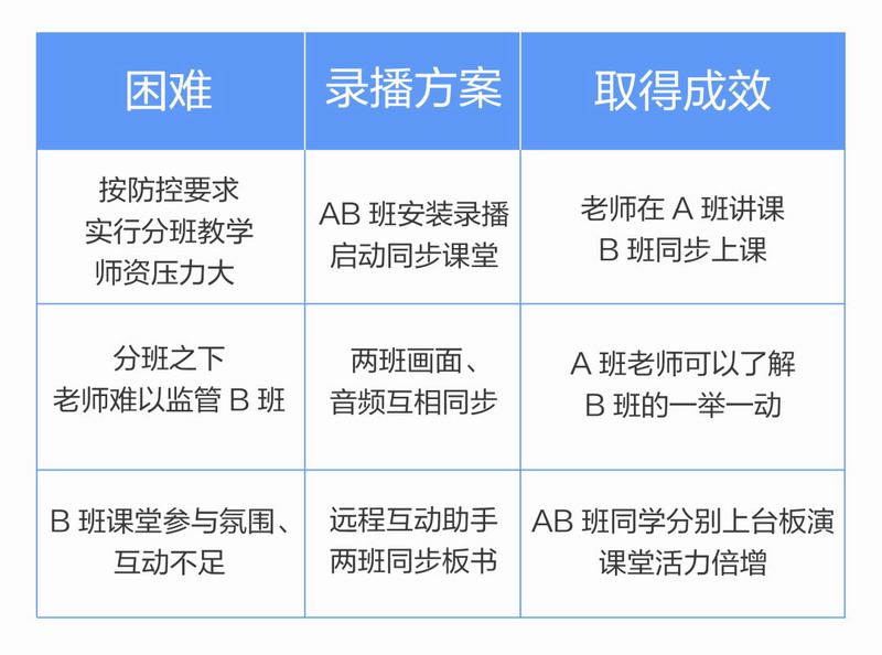 經(jīng)與希沃工程師溝通,他們很快敲定了方案:學校從2019年全面安裝希沃錄播系統(tǒng),基于錄播開展AB班教學,是最快速的方法。