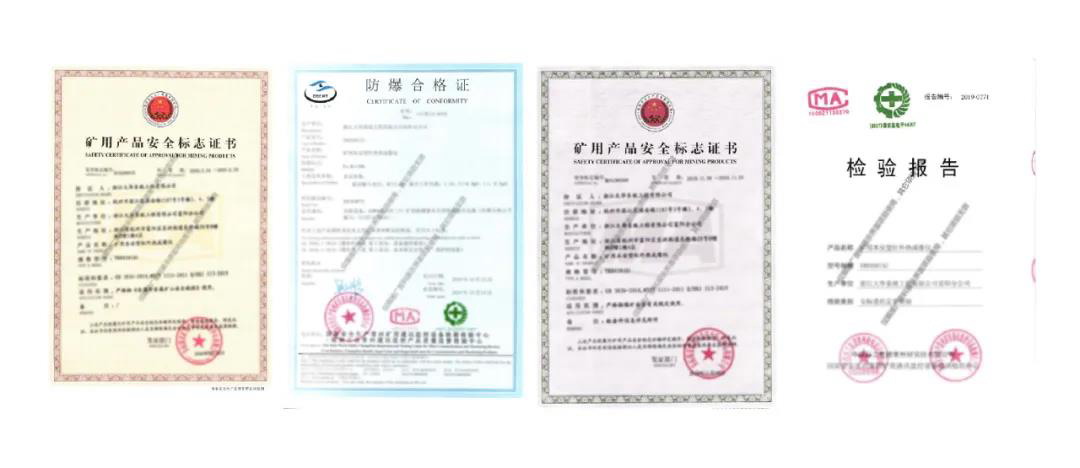 產(chǎn)品通過國家安全生產(chǎn)監(jiān)控設(shè)備檢測中心的安標(biāo)委托定型檢驗,在正常工作中不會產(chǎn)生電火花、電弧及高溫,從而避免引爆易爆物質(zhì)。同時,具備滿足煤礦安全有關(guān)規(guī)定和非煤礦山安全規(guī)程要求的兩項礦用產(chǎn)品安全標(biāo)志證書。