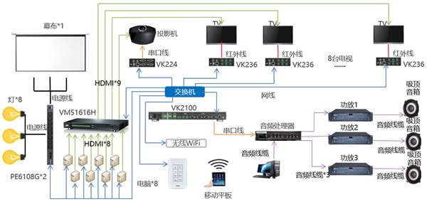 項(xiàng)目設(shè)計(jì)初期,該區(qū)塊鏈研究院提出7大展廳集中控制需求。要求可以集中控制所有燈光、投影機(jī)、音頻處理器;控制簡(jiǎn)報(bào)區(qū)幕布升降;控制整個(gè)展廳背景音源的切換和音量大小調(diào)節(jié);控制所有區(qū)域內(nèi)電視機(jī)音量大小、信號(hào)源、菜單;實(shí)現(xiàn)所有區(qū)域內(nèi)的視頻矩陣切換控制;PC端可以隨時(shí)展示PPT及宣傳影片,并可隨時(shí)播放、暫停、停止、關(guān)閉。