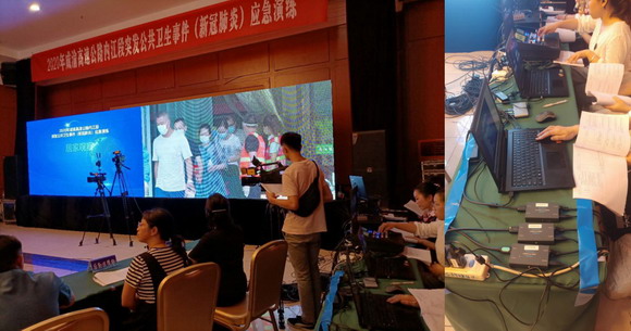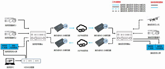 內(nèi)江日報社根據(jù)項目采購了若干美樂威NDI編解碼器,并部署到應(yīng)急演練網(wǎng)絡(luò)傳輸項目中。在應(yīng)急指揮部,2臺美樂威Pro Convert NDI編碼器用于連接電腦PPT畫面及導(dǎo)播臺切換的攝像機畫面,1臺Pro Convert NDI解碼器連接室內(nèi)的顯示屏,接收演練現(xiàn)場發(fā)送過來的視頻畫面;演練現(xiàn)場的部署略有不同,報社安裝了1臺Pro Convert NDI編碼器,用于連接導(dǎo)播臺切換的畫面,2臺NDI解碼器連接分別連接顯示屏,播放應(yīng)急指揮部發(fā)送過來的PPT畫面和視頻畫面。以上6個編解碼器都連接到本地千兆交換機,通過點對點光纖專線進(jìn)行互聯(lián)傳輸。現(xiàn)場的音頻信號也通過NDI協(xié)議傳輸,并通過HDMI音頻分離器在本地播放。這樣的方案搭建順利演繹了一場科學(xué)高效的衛(wèi)生防疫處置行動,達(dá)到了預(yù)期效果。