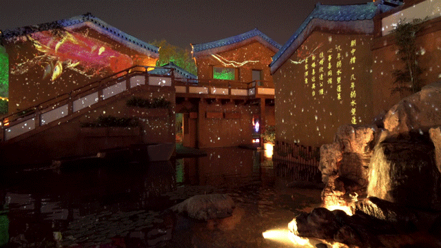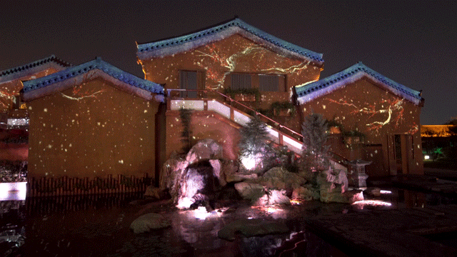 本次園區(qū)夜游升級,《禧墻》區(qū)域采用11臺Vivitek(麗訊) RU75953激光投影機打造而成,巧妙地利用原始建筑墻面,投射春夏秋冬四季不同景致。每當(dāng)入夜,園內(nèi)原本簡約古樸的仿宋建筑,在假山、水系、植物的映襯下,瞬間打造成一座360°開放式古典實景劇場。