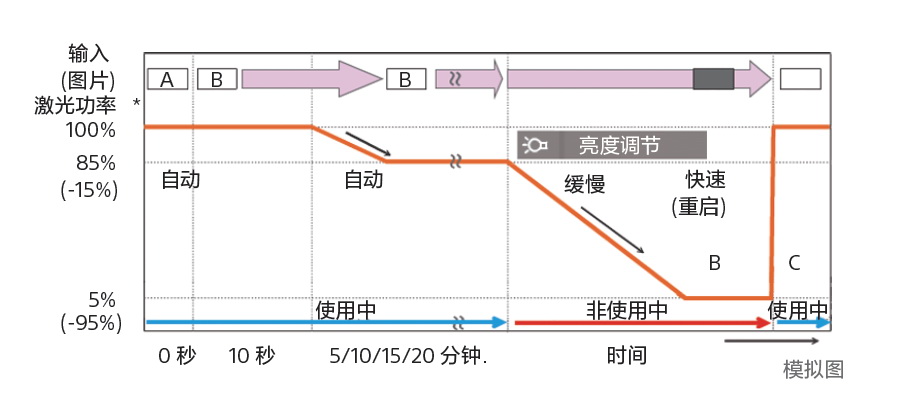 • 光源亮度變暗:輸入信號持續(xù)10秒無變化時,亮度會自動調(diào)暗約15%。經(jīng)過預(yù)先設(shè)定的一段時間后,若無操作,將自動檢測信號并調(diào)暗亮度至初始亮度的5%來減少消耗。