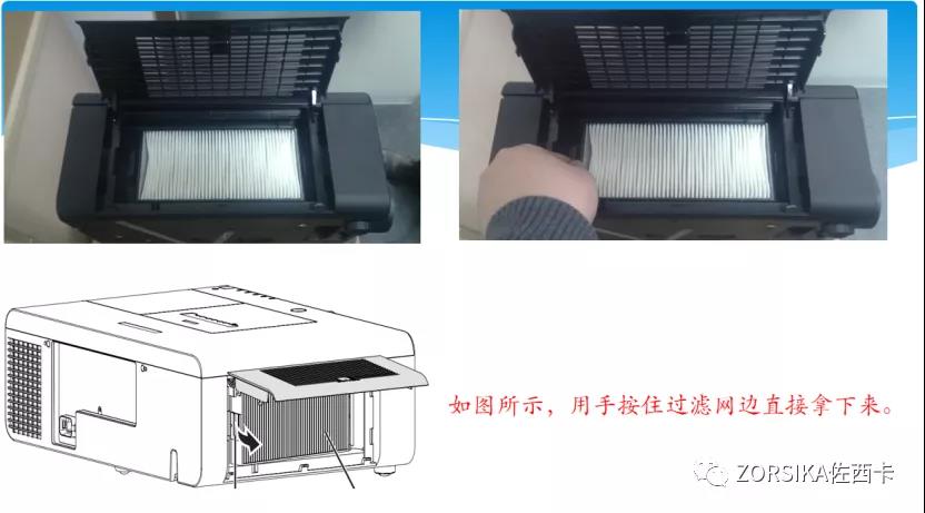 當(dāng)顯示更換信息過濾網(wǎng)指示燈“FILTER”因堵塞報警時,表示過濾網(wǎng)堵塞需要清洗或者更換過濾網(wǎng)。(表現(xiàn)為投影機(jī)電源關(guān)閉,F(xiàn)ILTER指示燈閃爍和待機(jī)指示燈ON(G)STANDBY亮起)。