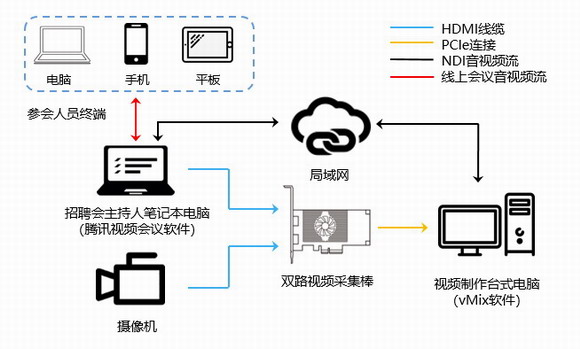 在這個方案中視頻制作和招聘宣講工作分在兩臺電腦上完成,一方面可以幫助主持人不受太多因素干擾,集中精力放在宣講和互動上,另一方面減少單臺電腦運行壓力,實現(xiàn)穩(wěn)定可靠的線上招聘。美樂威采集卡能廣泛兼容信號源,其自動檢測輸入信號的功能適合各種類型用戶使用。當(dāng)然根據(jù)用戶演播室的大小,實際需要接入視頻的通道數(shù),美樂威還有更多產(chǎn)品等您發(fā)掘!