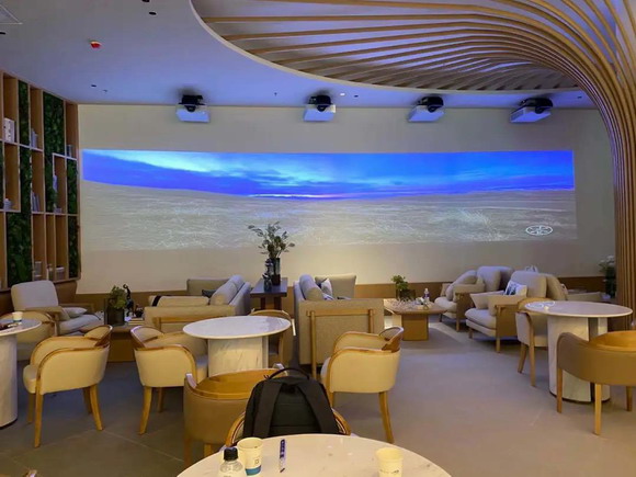 項目簡介:隨著多媒體技術(shù)的發(fā)展,商家們更傾向于用大屏幕吸引顧客的注意力。近期,大視MPG30X融合處理器成功應用于滁州某售樓中心大廳的投影系統(tǒng)。本次項目采用將四路高清信號輸入大視融合處理器,最終融合成6480x1080的投影畫面。
