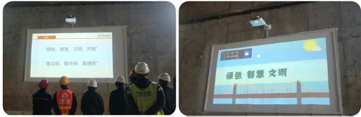 投影距離短、輸出畫面大,不僅受到教室、會議室等常規(guī)展示環(huán)境的青睞,也是城建、旅游景點等場景下的最優(yōu)選擇,這些場景對投影機的投射距離投射畫面的質(zhì)量以及現(xiàn)場抗干擾要求極高。LU-U500深入濟南城建集團某隧道施工現(xiàn)場,無畏塵土飛揚、空間狹小、環(huán)境光過亮的惡劣環(huán)境,短距離安裝、便捷畫面矯正,輸出色彩豐富清晰的畫面,同時配合內(nèi)置10W揚聲器,時刻為現(xiàn)場的工人敲響安全第一的警鐘。