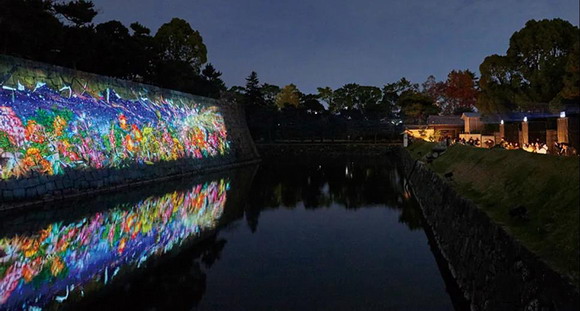 2018年,F(xiàn)LOWERS BY NAKED展主要集中在二之丸御殿廚房?jī)?nèi)。這次的展覽,則擴(kuò)大到了整個(gè)二條城,以便游客根據(jù)主題故事在城堡周?chē)顒?dòng)參觀。由于需要將影像投影到護(hù)城內(nèi)河的石墻上,范圍廣且距離遠(yuǎn),因此需要使用更高亮度的投影機(jī)。本次展覽使用了4臺(tái)亮度為12000 lm的松下激光投影機(jī)PT-RZ120JLW(中國(guó)型號(hào)PT-FRZ120C)。