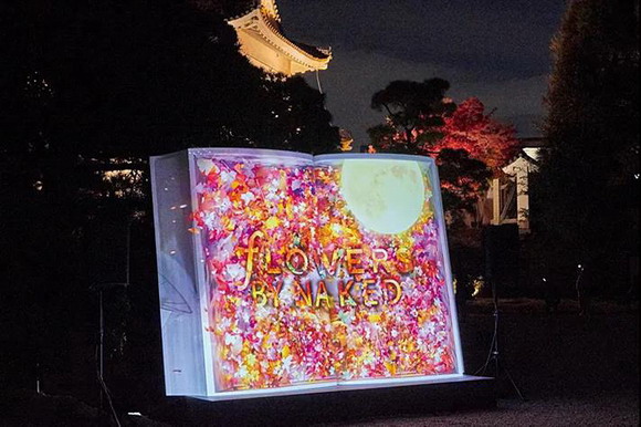 FLOWERS BY NAKED是一個(gè)關(guān)于花卉藝術(shù)的電子數(shù)字互動(dòng)型展項(xiàng),通過(guò)插花藝術(shù)、裝飾、投影畫(huà)面、游客交互、氣味和音樂(lè)帶來(lái)五種感官享受。FLOWERS BY NAKED由創(chuàng)意公司NAKED Inc.開(kāi)發(fā)并在日本國(guó)內(nèi)和海外推廣。首屆展覽于2018年在二條城舉行,主題為“花與傳統(tǒng)”。在二條城被定為世界遺產(chǎn)25周年之際,第二場(chǎng)展覽以“鳳凰”為主題在二條城舉辦。秋天的夜晚,二條城被鮮花和光影環(huán)繞,幻化成一個(gè)神奇的世界。