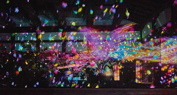 在作為重要文化財(cái)產(chǎn)的二之丸御殿廚房里,與插花藝術(shù)家元池坊的插花合作舉辦了一次展覽。此次展覽嘗試了一種全新的表達(dá)形式 – 利用全息幕布,將真實(shí)的插花藝術(shù)、影像、空間相融合。當(dāng)投影機(jī)將影像投射到全息幕布上時(shí),色彩艷麗的鳳凰和花朵在空中飛舞,作為花朵化身的鳳凰,最后,以化身為真花作為故事的結(jié)局。此外,還另有體感互動(dòng)展區(qū),通過(guò)人的動(dòng)作而進(jìn)行影像、音樂(lè)、氣味的變化,令參觀者們通過(guò)自身感官而感受花朵們那曇花一現(xiàn)的生命及美麗。