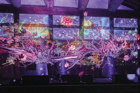 利用全息投影幕布將數(shù)字影像展現(xiàn)的鳳凰與真實(shí)的插花融為一體。