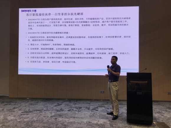 深圳市白雪投影視聽科技聯(lián)合創(chuàng)始人岳標(biāo)做了投影顯示載體的發(fā)展及應(yīng)用注意事項(xiàng)的主題報(bào)告。