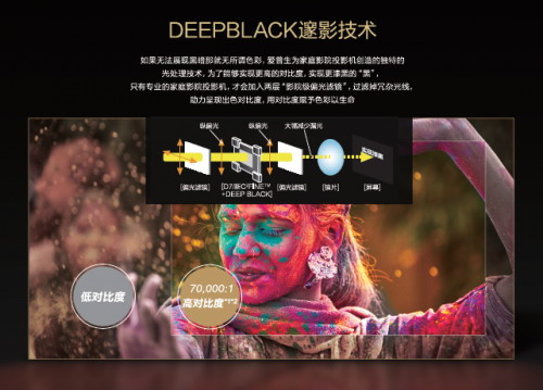 高亮度會給遮光條件不好的環(huán)境帶來更好的畫質,但是過高的亮度,有可能會導致對比度的下降,比如讓黑色沉不下去,嚴重的會變?yōu)榛疑,從而降?a href=http://rcfh.com.cn/movie/index.htm target=_blank>家庭影院的效果。明和暗的對比,直接決定了畫面帶來的沖擊力,對比度越大意味著能夠呈現(xiàn)的黑白過渡細節(jié)越多,色彩層次亦會更加細膩。愛普生CH-TW5800投影機,通過愛普生獨有的專門為家庭影院創(chuàng)造的DeepBlack技術,對比度高達70000:1*3*4,讓亮的地方更亮讓暗的地方更暗。無論原電影畫面色彩是深抑或是淺,都能完整展現(xiàn)出畫面的景深與細節(jié)。無論是白天使用還是晚上使用,都能帶來清晰、明亮的影像,輕松觀影,還等什么。