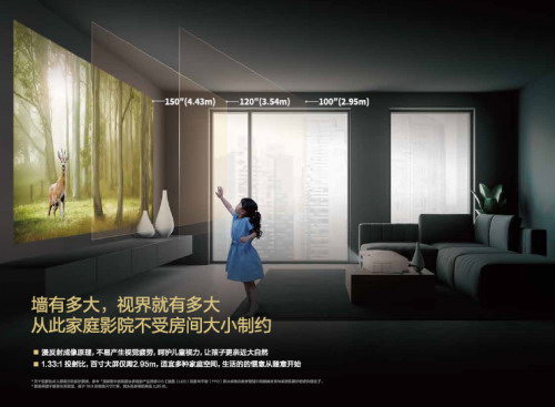 大范圍焦距及高倍廣角鏡頭,約3米就可以輕松投放出百寸大屏。百英寸巨幕畫面下,畫質依然感人,分毫畢現(xiàn),豐富逼真,還原度高。讓家庭影院不再受空間限制,墻有多大,畫面就有多大,不論是臥室還是客廳,隨時隨地暢享家庭影院。